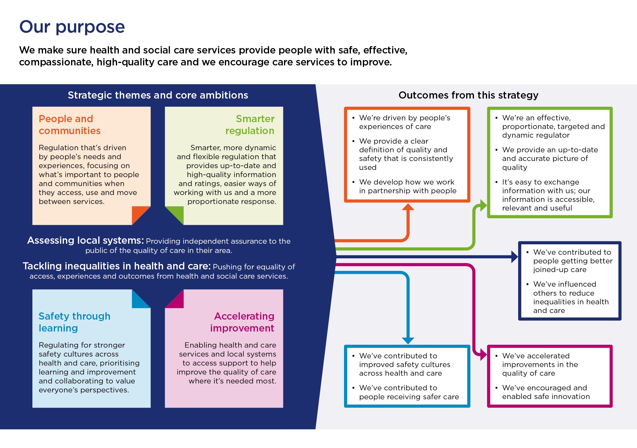 This new strategy strengthens our commitment to deliver our purpose: to ensure health and care services provide people with safe, effective, compassionate, high-quality care and to encourage those services to improve. Our strategy is purposefully ambitious, and to implement it we will need to work closely with others to make it a reality. We’ll review this strategy regularly so we can adapt to changes and be prepared for what the future holds.